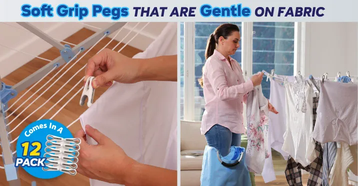 - 12 pack of Soft Grip pegs - Cushioned grip that’s gentle on fabric. Perfect for hanging your washing on the Eezy Breezy Smartline