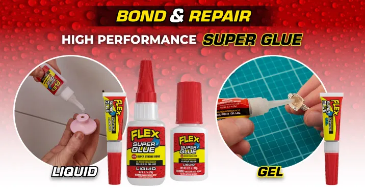 FLEX SUPER GLUE™ Liquid flows like water and is great for horizontal and non-porous surfaces. FLEX SUPER GLUE™ Gel’s thicker formular is great for vertical and porous surfaces. Once fully cured, both formulas have the same high-performance bond.