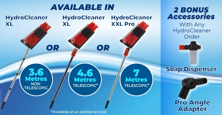 - OR UPGRADE to the HydroCleaner XXL Pro* with a fully telescoping handle that extends to 7 metres, to reach extra high places like solar panels or the roof