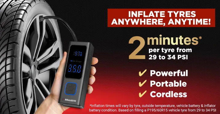 *Inflation times will vary by tyre, outside temperature, vehicle battery & inflator battery condition. Based on filling a P195/60R15 vehicle tyre from 29 to 34 PSI.