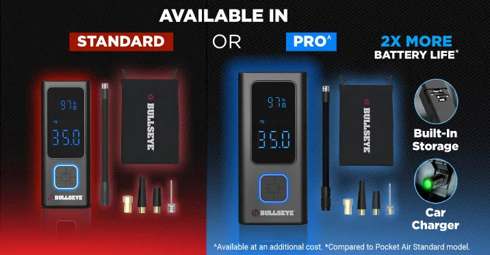 Pocket Air by BULLSEYE is ultra powerful, durable and puts the power of an air compressor in the palm of your hand! It can inflate a tyre from 29 to 34 PSI in 2 minutes*. The Pocket Air by BULLSEYE Max. Pressure is 100 PSI and the Pocket Air PRO by BULLSEYE Max. Pressure is 120 PSI.