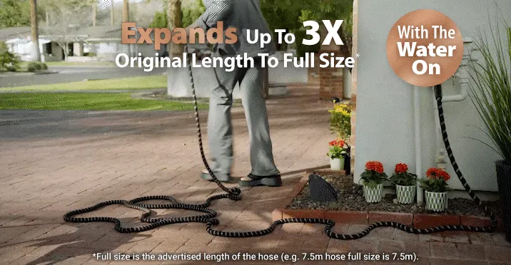 - 7.5 metres – this hose expands from its compact original size of 2.5m, to the full 7.5m length when the water is turned on.