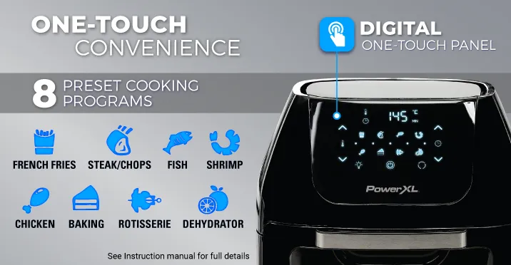 - 8 one-touch digital preset cooking programs – fries, roast, bake, fish, shrimp, chicken, rotisserie and dehydrate