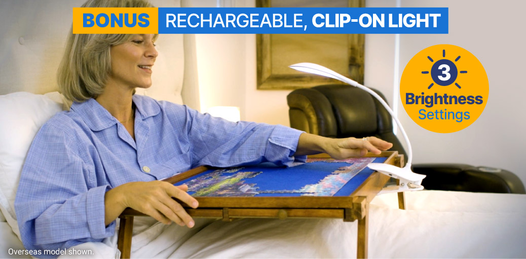 Puzzable’s BONUS rechargeable, clip-on LED light has three brightness setting – low, medium & high.