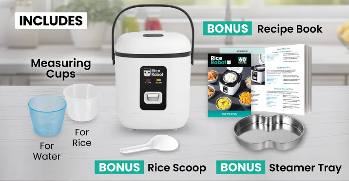 - BONUS Rice Robot Recipe Book, with 60 delicious recipes